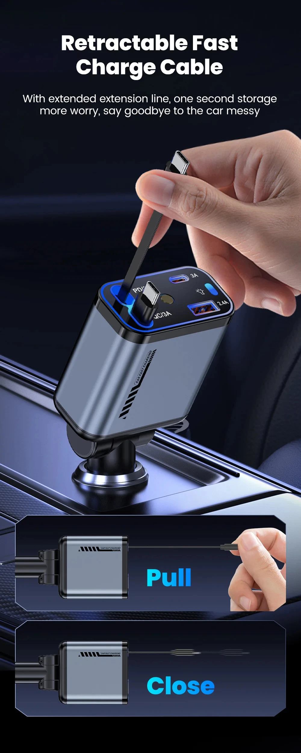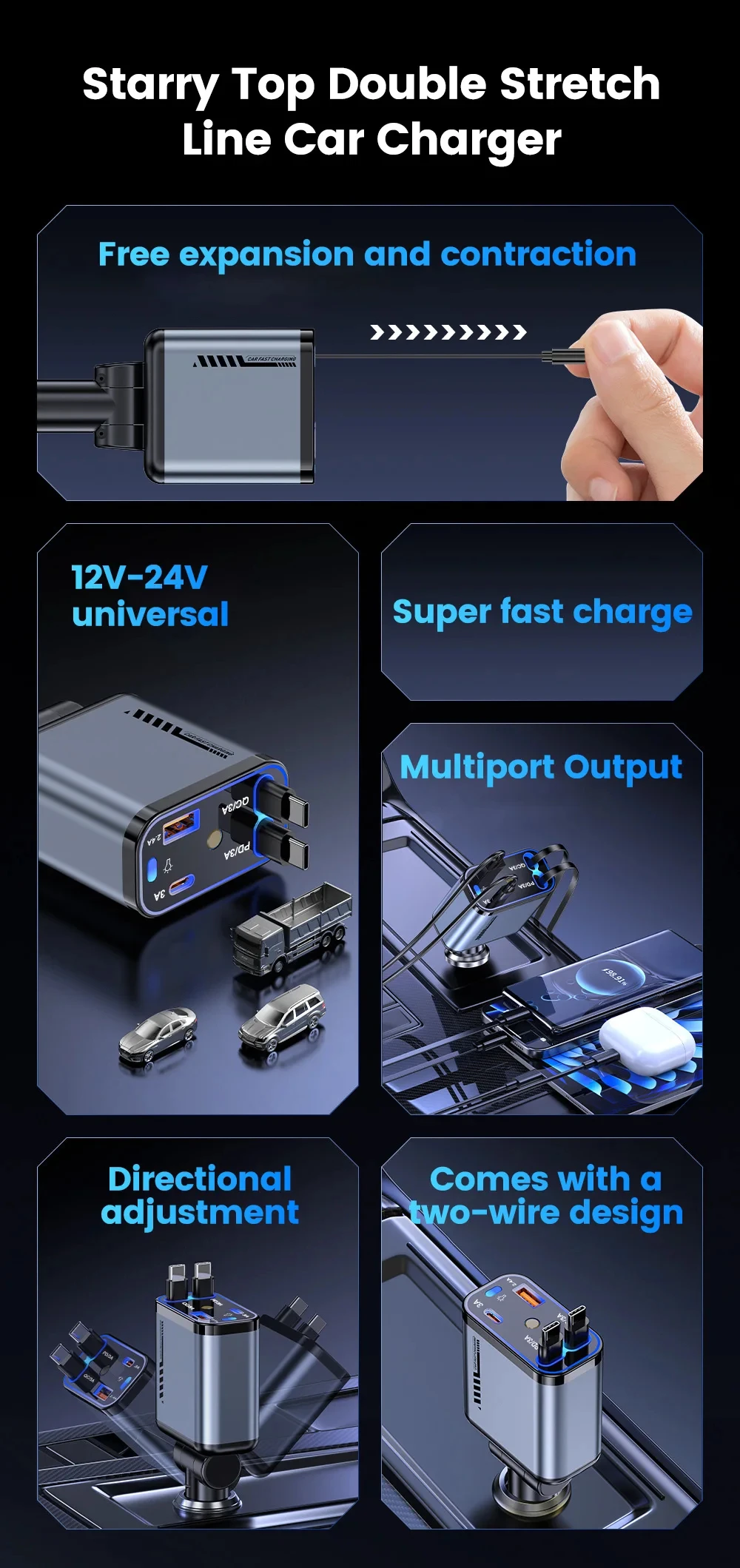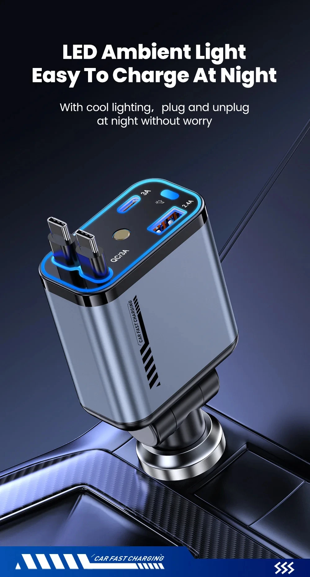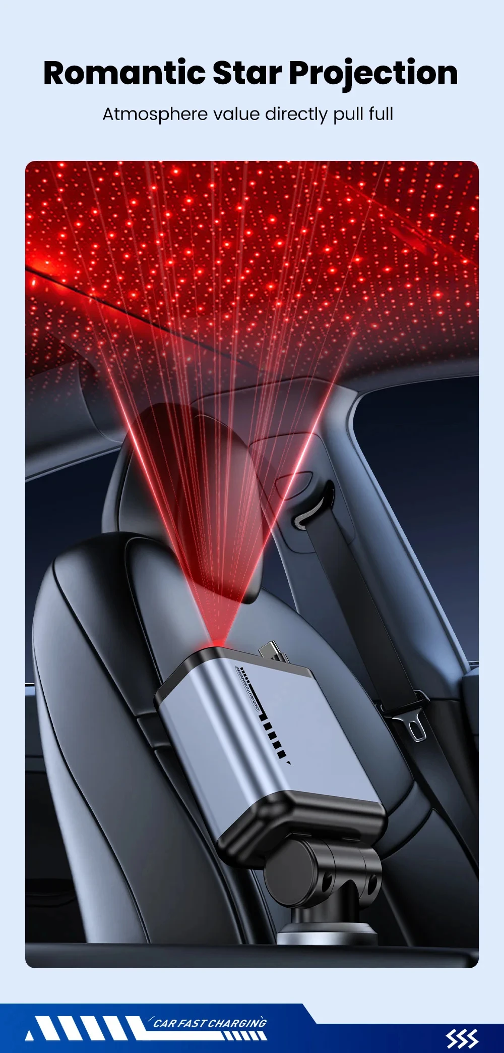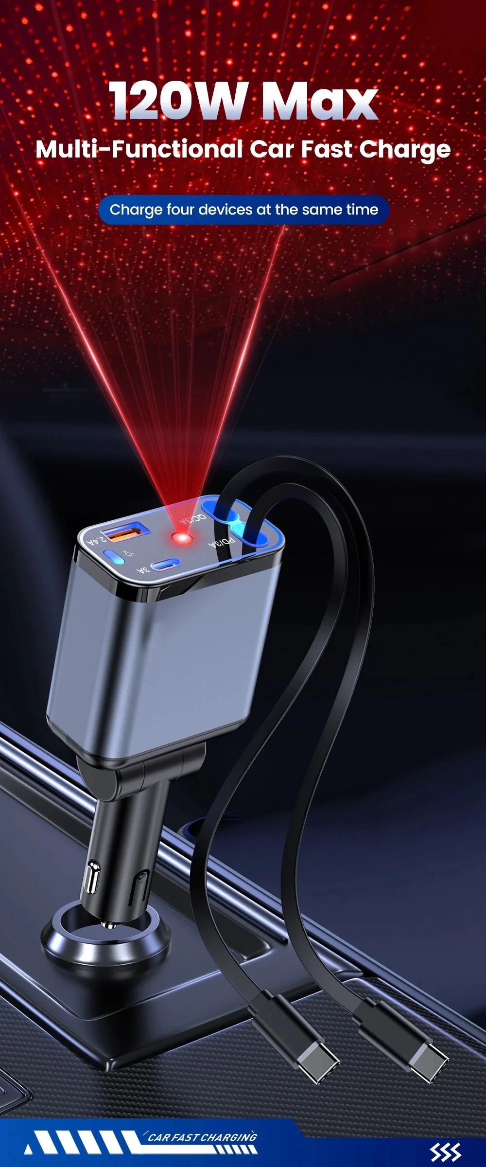 Starry Sky Roof Car Charger120W Super Fast Charging Car Charger with Retractable Cable Ambient Light for Car Interior Cigarette Lighter