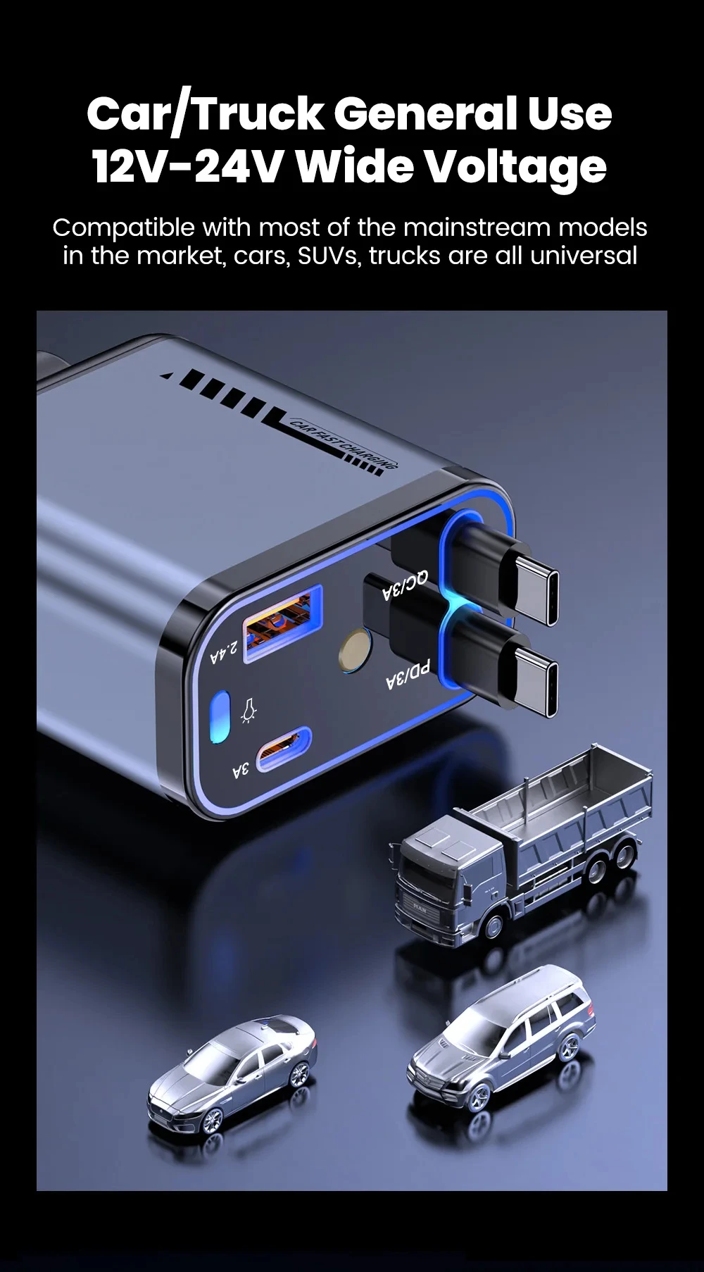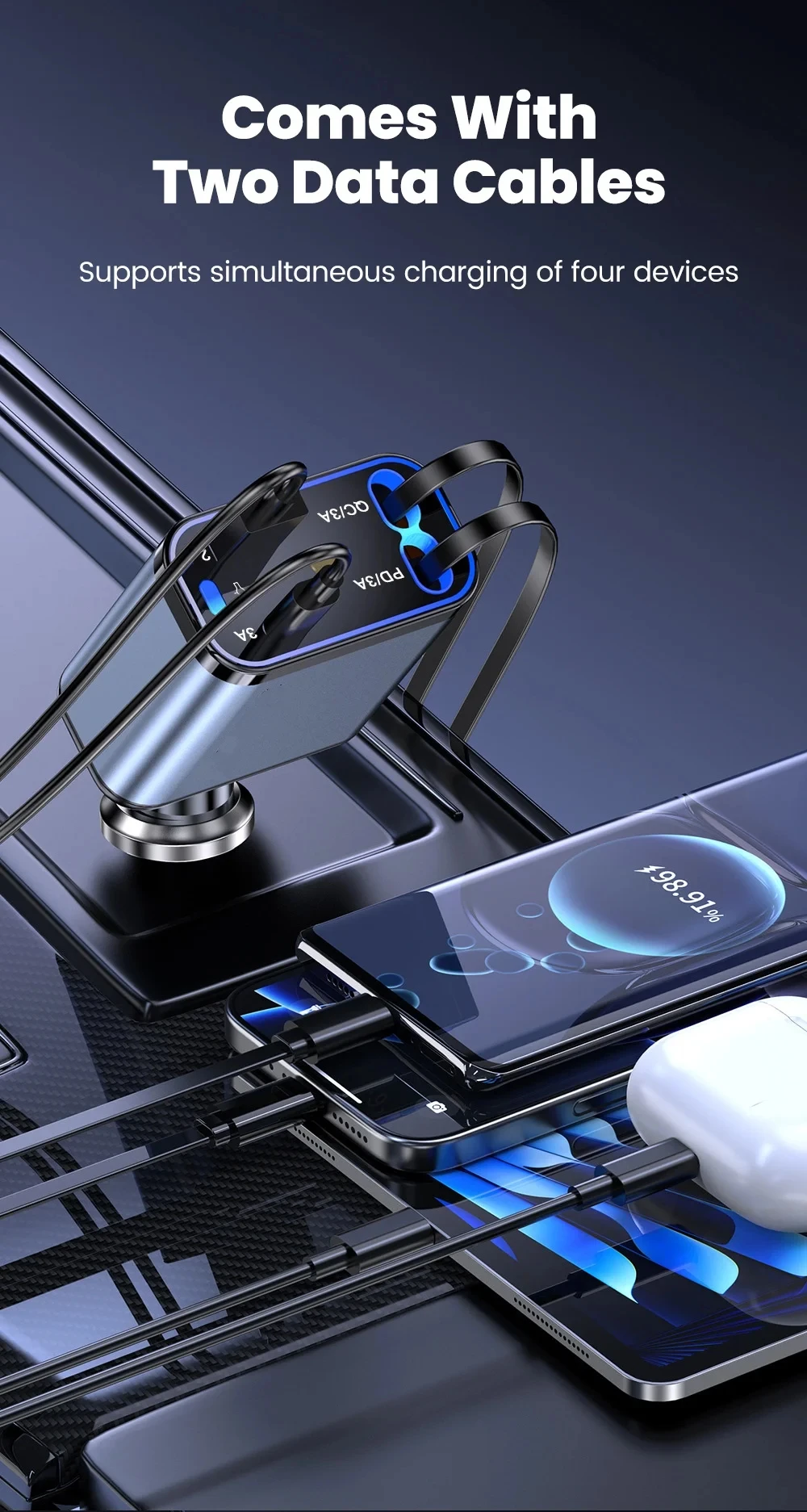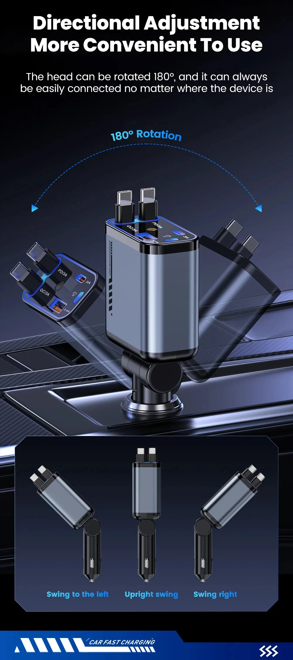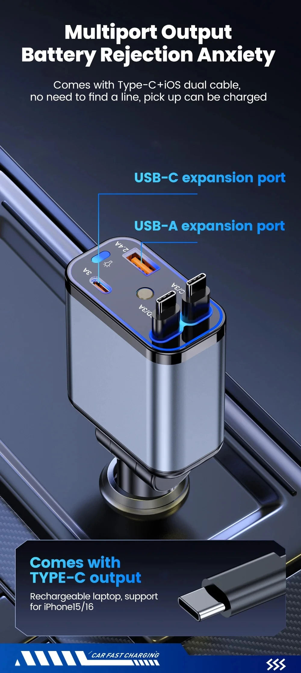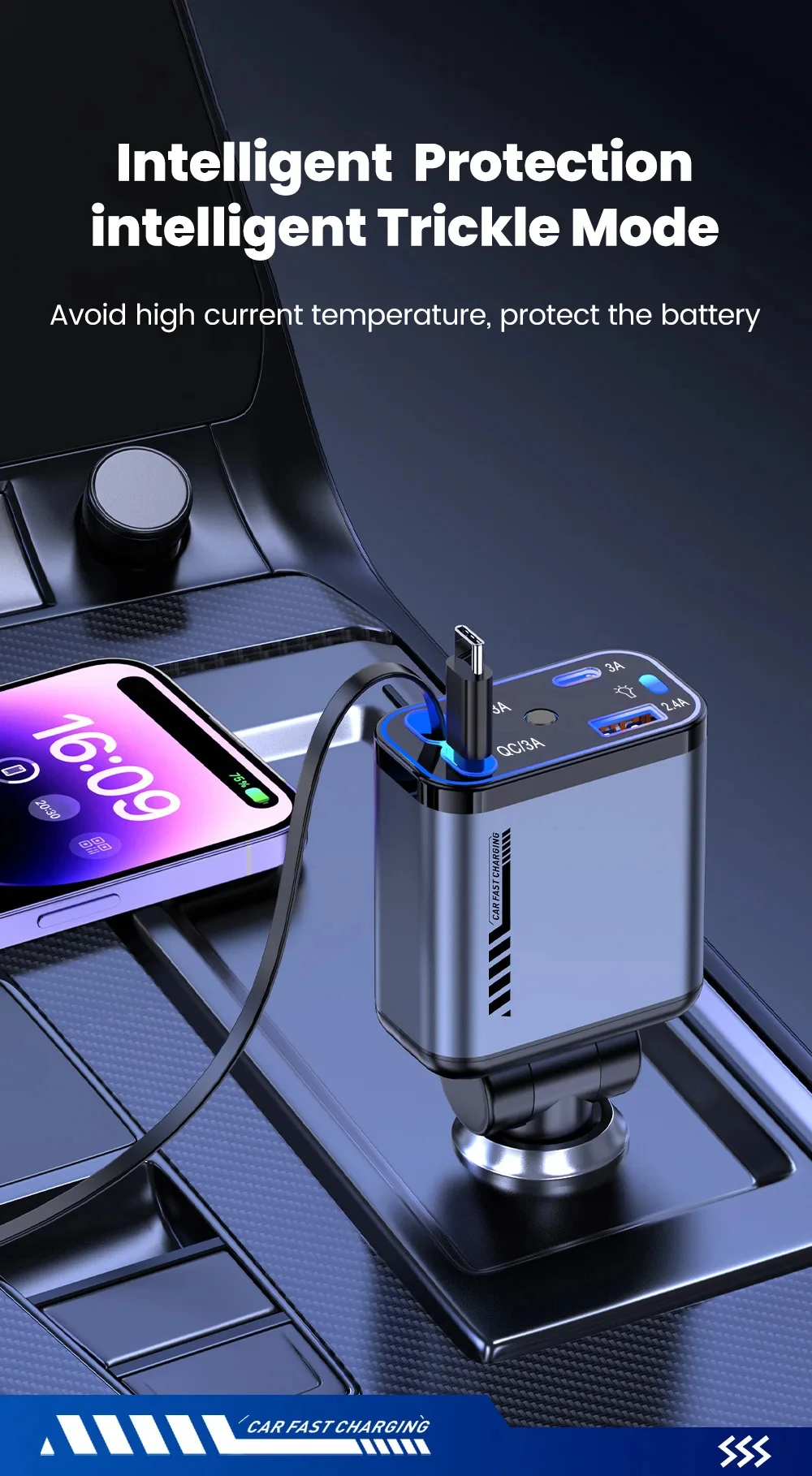 Starry Sky Roof Car Charger120W Super Fast Charging Car Charger with Retractable Cable Ambient Light for Car Interior Cigarette Lighter